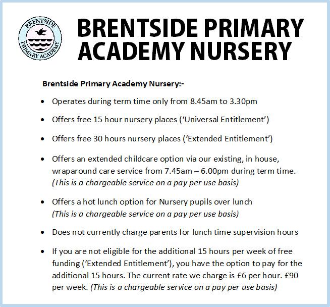 Brentside Primary Academy operate a term time only Nursery and offers provision for 15 hours to 30 hours per week for those eligible.